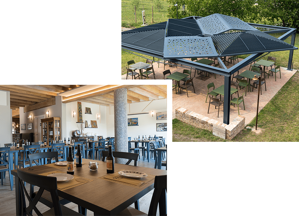 In inverno ci sono tre sale disponibili: la nostra ampia sala interna al piano terra, la terrazza coperta con affaccio sulla vallata e la tap room. Valigie vintage e fotografie di viaggio, mobili di recupero raccontano l’anima del nostro progetto.